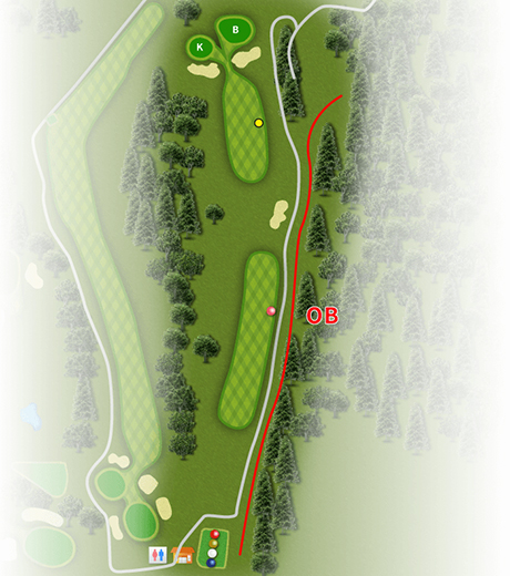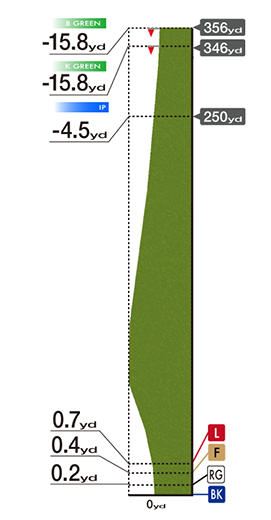 グリーン面が奥に傾斜しているだけでなく、グリーンに近づくほど左足下がりとなり、ショットの精度が問われるホールです。