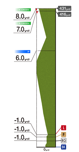南コースで最も距離が長く難度の高いパー4です。ティショットでしっかりと距離を稼ぎたいところですが、グリーン奥まで両サイドOBが続くため無理は禁物。そのため、ティショットは方向性重視でやや左サイドが狙い目。第2打は右サイドのOBが浅いため、残りの距離によっては刻むほうが確実。3オン狙いで第2打をグリーン手前に運べれば、やさしいアプローチが残るため寄せワンも可能。