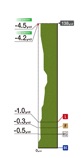 打ち下ろしのパー3です。距離の短いショートホールですが、左サイドは下っていて、OBが浅い。また、風の影響を受けやすいため状況に応じたクラブ選択が必要となります。距離間を正確に把握できるかがコース攻略のカギとなります。グリーンのアンジュレーションは比較的少ないため、ピン位置にかかわらずグリーンセンターを狙えばバーディチャンスとなります。
