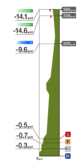 ティショットで230ヤード以上飛距離が出ると、セカンド地点は左足下がりの難しいライになるため、第2打の距離感が難しくなります。