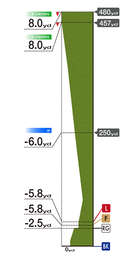 ピンポジションを確認し、打ち上げの距離感を考慮した第3打がこのコースを攻略するポイントとなります。グリーンは奥から手前にきつい下り傾斜となります。
