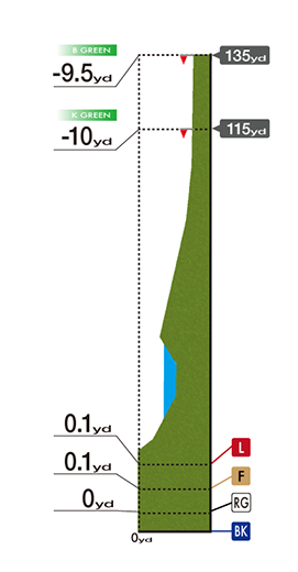 大胆に打ち下ろしていくホールロケーションは風の影響を受けやすく、距離のジャッジが難しいところ。打ち下ろしを意識しすぎて手前のガードバンカーにつかまると、難しいバンカーショットとなります。また、ティショットをグリーン左に外すと崖下に落ちてしまい、パーセーブが難しくなります。