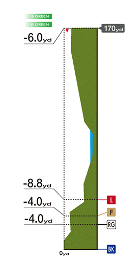 グリーンの手前には深いバンカーが待ち受けているだけでなく、Aグリーン左はすぐOBとなるため、左へのミスは命取りとなります。